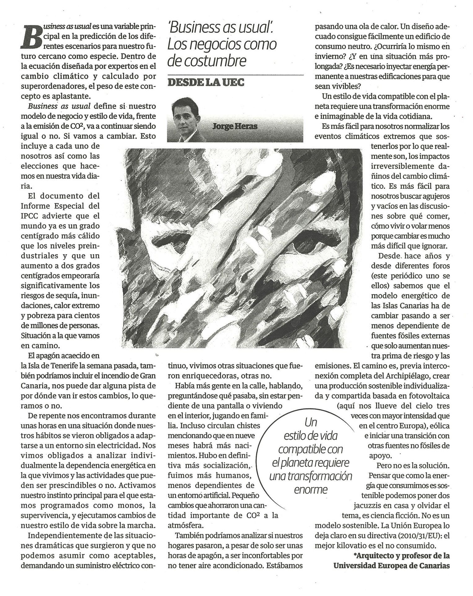 Publicamos un artículo de opinión para la prensa en la edición del periódico El Día del 11 de octubre de 2019 sobre el concepto ‘Business as usual’ como variable en la predicción de los diferentes escenarios para nuestro futuro cercano como especie. Business as usual define si nuestro modelo de negocio y estilo de vida, frente a la emisión de CO2, va a continuar siendo igual o no.